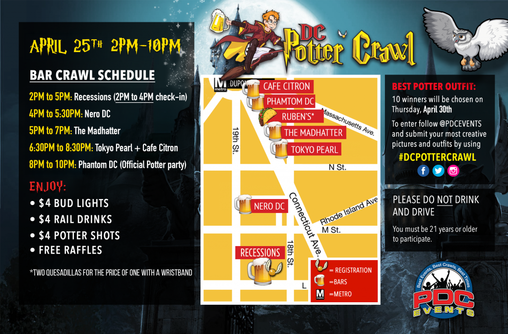 What You Get: A refillable magical Potter mug, party favors, access to some of Dupont Circle’s best bars, raffle entry for great prizes and free pictures of the event!