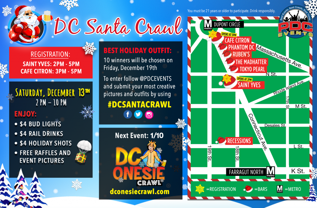 Published: 12/11/2025Below you will find the DC Santa Crawl 2025 route map. Plan accordingly, don’t get lost, have an awesome time, and most importantly, be safe! See you at the bar crawl!